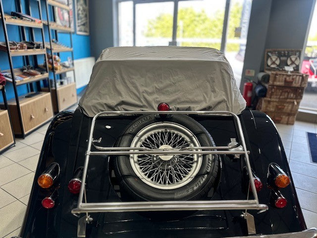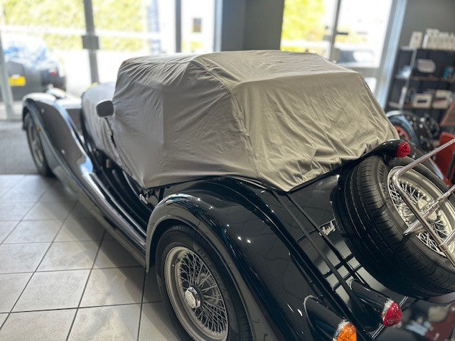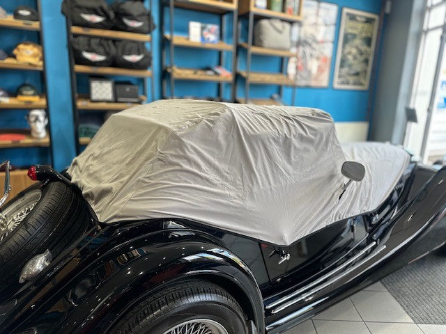 Designed to cover the hood of your Morgan. Slits for door mirrors. Elastic eyelets to secure.